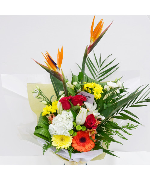 Bird of paradise, Roses, Hydrangea, gerbera, Lily, Chrysanthemum, Lithuanians and Forage.