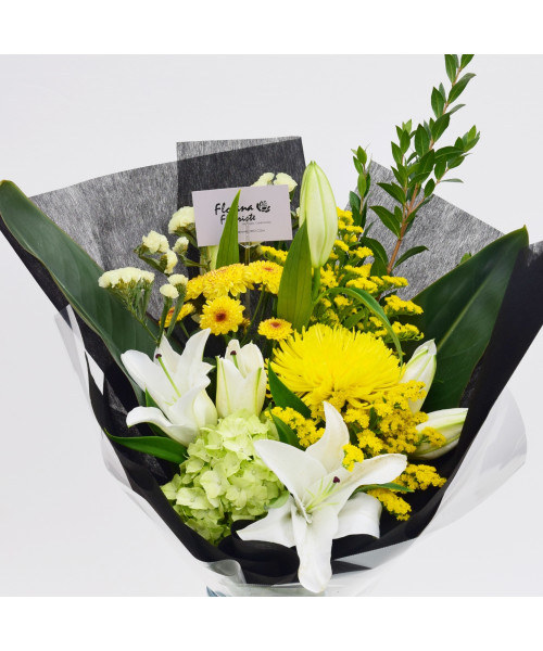 Lily, Chrysanthemum, Solidago, Hydrangea, Statice and Foliage.