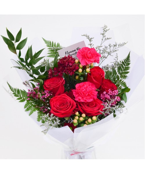 Roses, Carnations, Hypericum berries, Wax flowers, Caspia and Folages.
