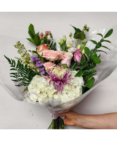 Hydrangea, Roses, Spray roses, Lisianthus, Chrysanthemum, Hypericum berries, Wax flowers, Statice, Ruscus, Leather leaves, Aspidistra